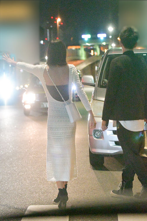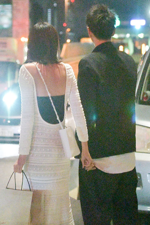 都内の高級イタリアンレストランで食事を楽しんだ2人。桐谷は背中が大胆に開いたデザインの白いタイトなワンピース姿。合わせたジル・サンダーのバッグも白で